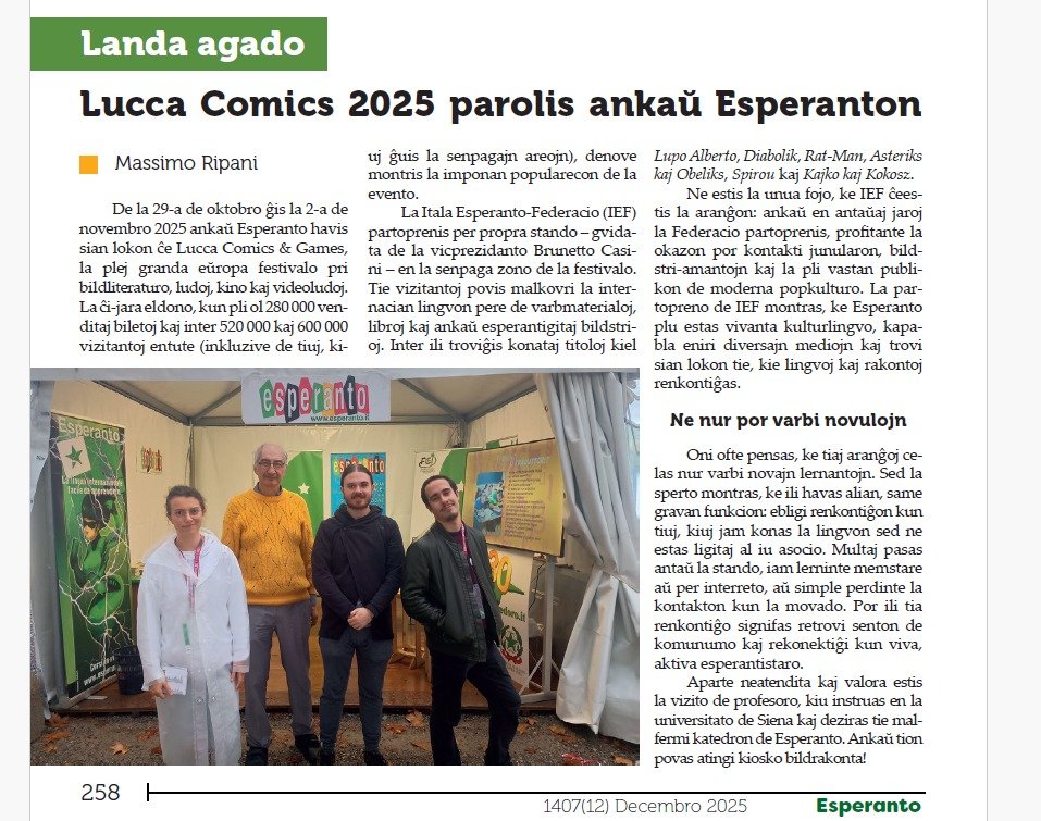 Per noi italiani spicca soprattutto l’articolo su Lucca Comics & Games 2025, che quest’anno ha parlato anche Esperanto. La presenza della Federazione Esperantista Italiana all’interno di uno dei più grandi festival della cultura pop è un passo importante per avvicinare nuovi curiosi, giovani e appassionati al mondo della lingua internazionale.