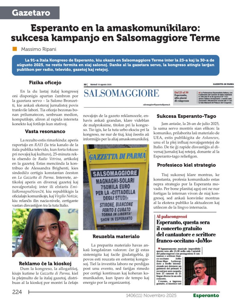 Sul fronte dell’informazione e delle relazioni esterne, la rivista segnala una campagna di successo a Salsomaggiore Terme, dove l’Esperanto ha ottenuto ampia visibilità sui media locali. Si parla inoltre del Gruppo di Amici del Multilingvismo presso le Nazioni Unite, di cui UEA è parte attiva, a conferma dell’impegno dell’associazione nel promuovere la diversità linguistica a livello internazionale.