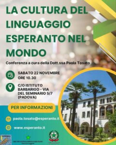 Conferenza della Dott.ssa Paola Tosato – sabato 22 novembre 2025, ore 10.30, Istituto Barbarigo Il Gruppo Esperantista Padovano “Giovanni Saggiori” (GEP), in collaborazione con l’Associazione culturale Serendo, organizza la conferenza “La cultura del linguaggio Esperanto nel mondo”, a cura della…