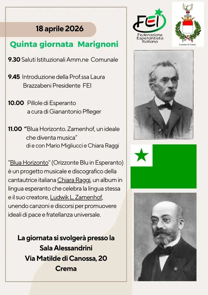 Si terrà sabato 18 aprile 2026 a Crema la *Quinta Giornata Marignoni*, iniziativa promossa dal movimento esperantista e dalla Federazione Esperantista Italiana per ricordare la figura di *Daniele Marignoni*, cittadino cremasco ed esperantista, autore della prima grammatica italiano-esperanto.