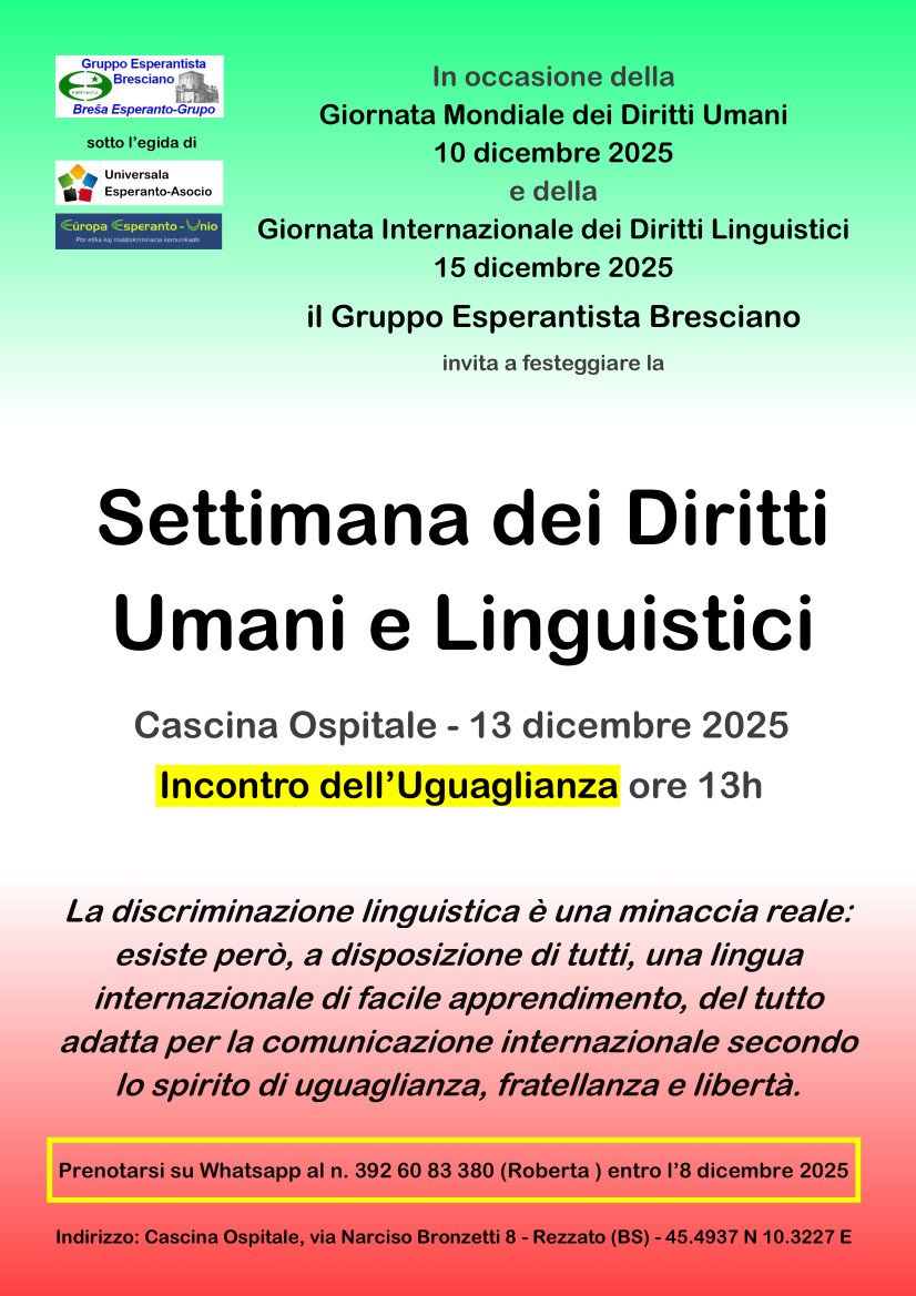 Aderendo entusiasticamente all’iniziativa internazionale, il Gruppo Esperantista Bresciano organizza l’Incontro dell’Uguaglianza, sabato 13 dicembre 2025 dalle ore 13, presso Cascina Ospitale (indirizzo in calce e nella locandina), per invitare tutti coloro che si riconoscono nei valori dei diritti umani e linguistici, e che –pur non avendola *ancora* imparata– sostengono la lingua internazionale esperanto e l’ideale di fratellanza, uguaglianza e libertà che essa esprime.